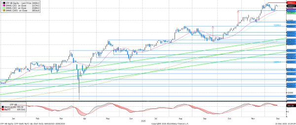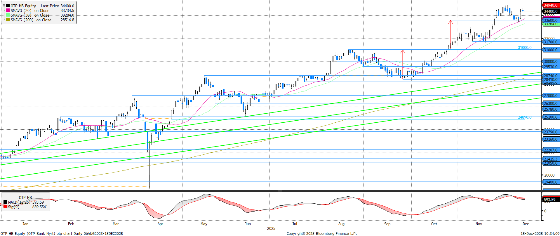 Az OTP egy rövid korrekció során visszatesztelte a 20 napos mozgóátlagot, majd ezt követően ismét északnak vette az irányt. Akár egy még újabb történelmi csúcs is összejöhet az év végén, felülmúlva a két héttel ez előtti 34.940 forintos csúcsot. Az elmúlt napokban rekord célár érkezett az OTP-re, ugyanis a JP Morgan 39.700 forintos célárral jelentkezett.