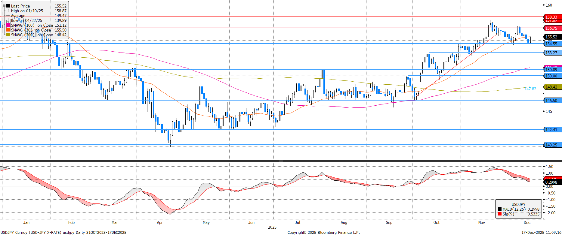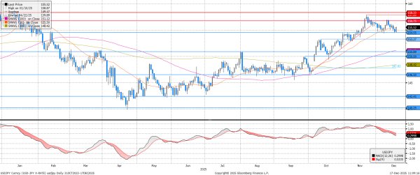 A jen erősödése megállt a 154,6-os támaszszintnél, innen pontosan a 30 napos mozgóátlagig korrigált vissza. A Bank of Japan kamatemelése a piaci várakozások szerint közel 100%-ig biztos, de ha a kamatok további emeléséről szólnak majd a nyilatkozatok, az segíthet az USDJPY árfolyam csökkenésében is. A technikai kép szerint a csökkenő lokális csúcsok és az MACD csökkenő szintje alapján elképzelhető, hogy sikerül áttörni az elsődleges támaszon.