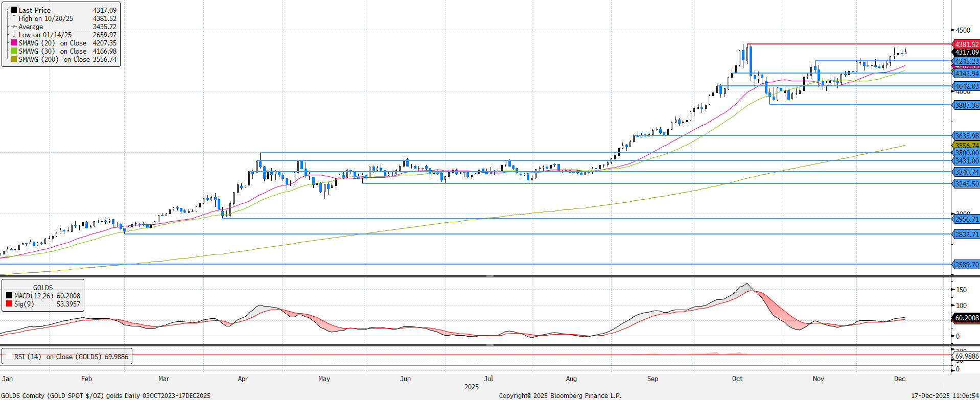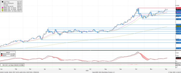 Napközben nagy kilengésekkel, de a nyitó- és záróár közti minimális különbséggel araszolt felfelé az arany árfolyama. Az RSI elérte a 70-es szintet, ami már a túlvettséget jelzi, azonban a menedékeszközök iránti kereslet miatt nem zárható ki a mindenkori rekord 4382-es ellenállás érintése sem.