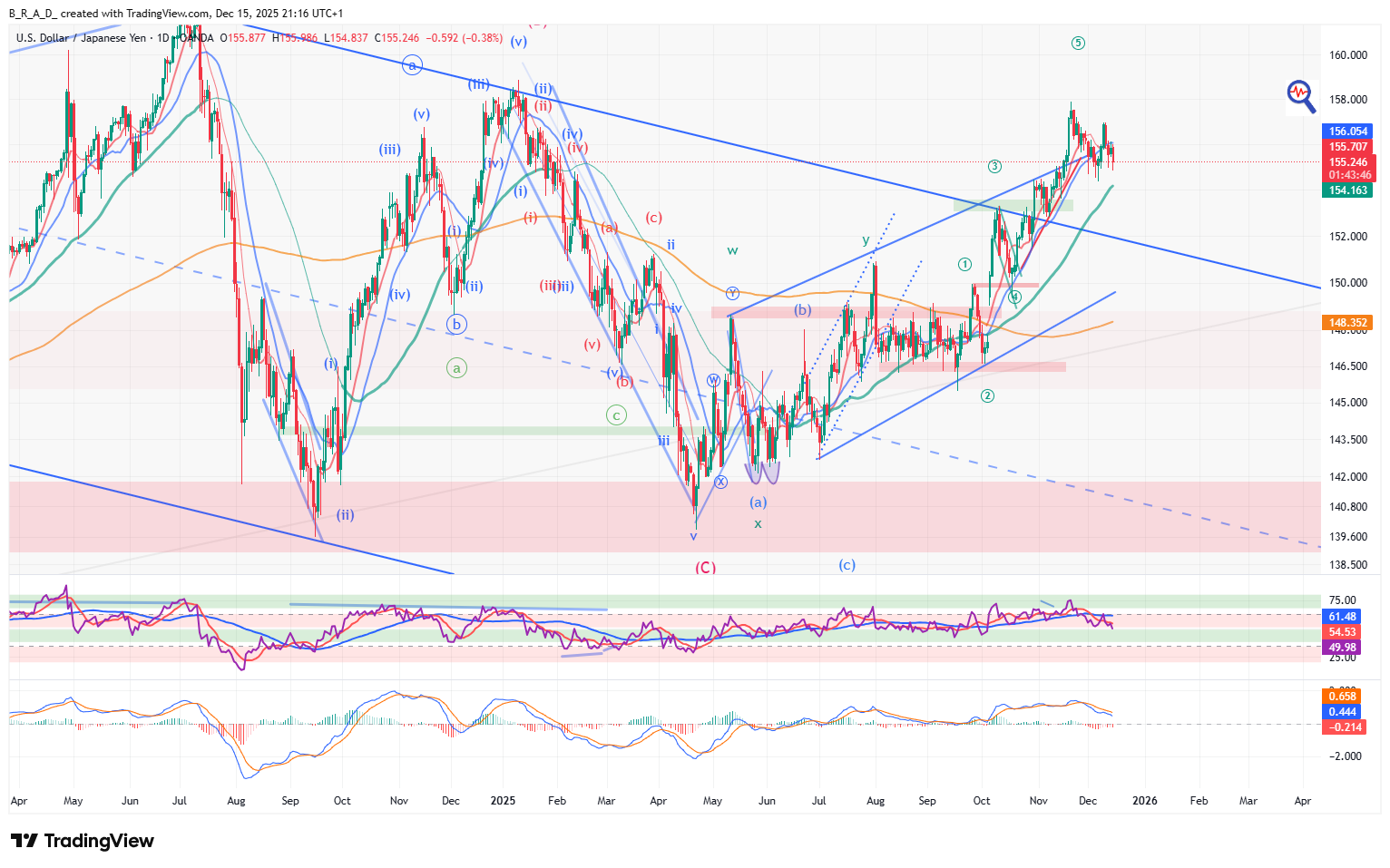 Az 50 napos mozgóátlag megfogta az esést és északnak fordult róla az árfolyam, újraélesztve a bull reményeket és az elsődleges szcenáriónk létjogosultságát. A chart képe alapján reális a lehetősége annak, hogy további emelkedés érkezik a piacra, első körben a december 9-ei csúcsig. Amennyiben sikeresen leküzdi ezt az ellenállást, akkor jelentős tért nyithat maga előtt és újabb lokális csúcs születhet. Amennyiben lefordul a szintről az árfolyam, akkor ismét visszatérhet 154,200 környékére az árfolyam, sőt akár a korábbi – eséshez kapcsolt – másodlagos célárat is elérheti 153,800-nál.