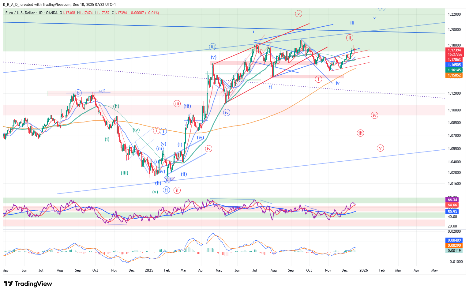 A déli irányú lefordulás elérte a korrekciós csatorna tetejét, mely egyben a 10 napos mozgóátlag szintje is. A déli irányba tartó mozgást az elsődleges szcenáriónk szerint egy korrekciós hullám első alhullámának gondoljuk, a második alhullám a korábbi (lokális) csúcs közelébe viheti vissza az árfolyamot. A korrekció feltételezett formája lapos, távolabbról szemlélve egy széles sávban történő oldalazást hozhat, mely az ünnepek körül kialakuló piaci lassulás esetében 1,167-1,183 közötti sávban mozgathatja az év hátralévő részében az árfolyamot.