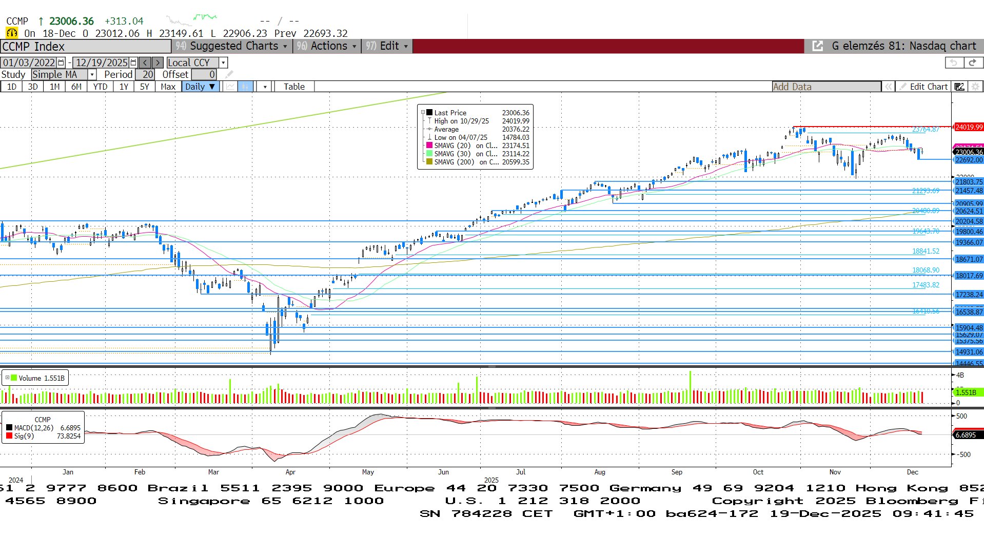 A csütörtökön közzétett adatok szerint a vártnál alacsonyabb lett az amerikai infláció, ami növeli a további kamatcsökkentések esélyét. Ez kedvező a részvénypiac szempontjából, így megfordulni látszik az elmúlt napok negatív trendje. A Nasdaq felpattant, de a 20 napos mozgóátlag megállította az emelkedést. A héten az MACD indikátor eladási jelzést adott, ami óvatosságra int az infláció miatt optimistábbá váló hangulat közepette.