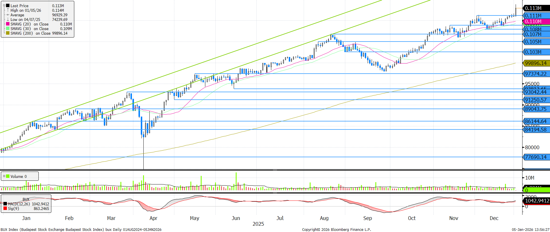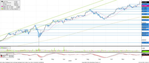 Az év utolsó napjaiban is a történelmi csúcs közelében volt a BUX, de a lendületet az új év hozta meg, így ma új csúcsra ugrott az index. A technikai kép annak ellenére pozitív, hogy az RSI 70 pont fölötti értéke túlvettségre utal. Ellenállást a lélektani 115.000 pontos szint jelenthet.