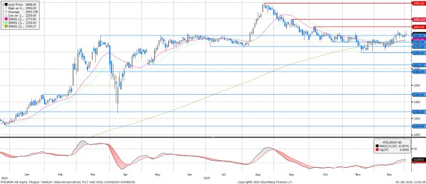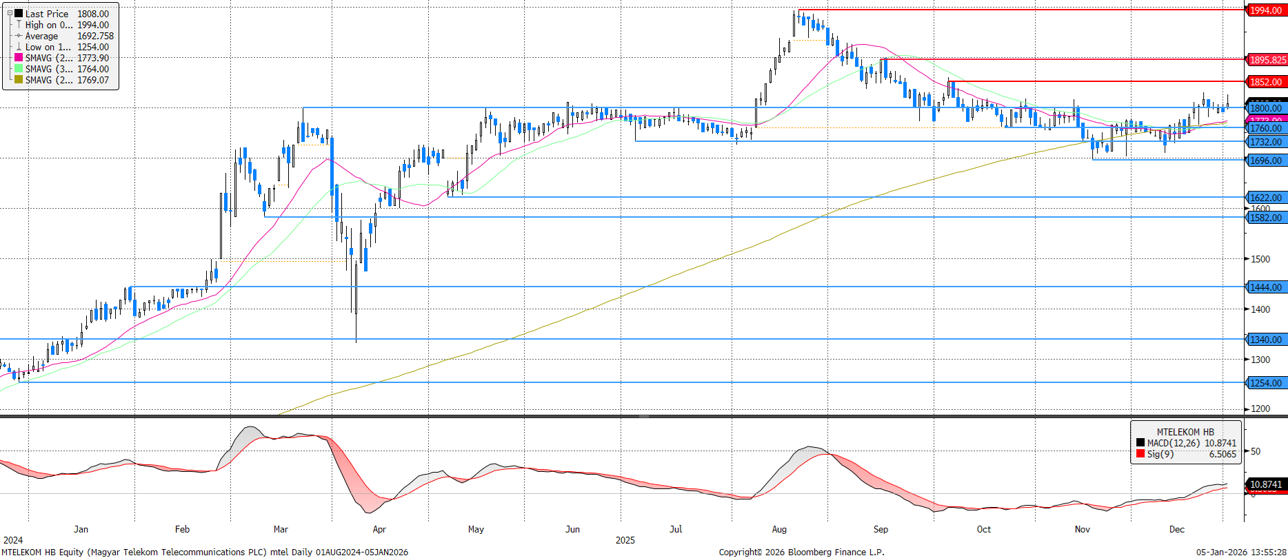 Az MTel árfolyama átmenetileg beesett az 1.800 forintos szint alá, de végül sikerült megkapaszkodnia a szint fölött. A visszatesztelést követően az árfolyam emelkedése valószínűsíthető, mely során első körben az októberi lokális csúcsot veheti célba a kurzus 1.852 forintnál.