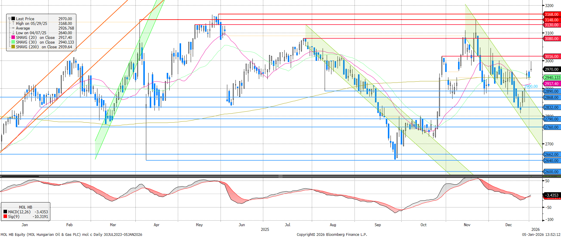 A MOL árfolyama az elmúlt néhány kereskedési nap során sorra törte át a mozgóátlagokat. Fundamentálisan a fő meghatározó tényező továbbra is a NIS lehetséges megvásárlása, mely kapcsán nemcsak a szerb sajtó, de Aleksandar Vucic szerb elnök is a MOL-t emlegeti, mint lehetséges vevőt. A NIS január 23-ig kapott átmeneti működési engedélyt az USA-tól, így a következő három hétben felgyorsulhatnak az események.