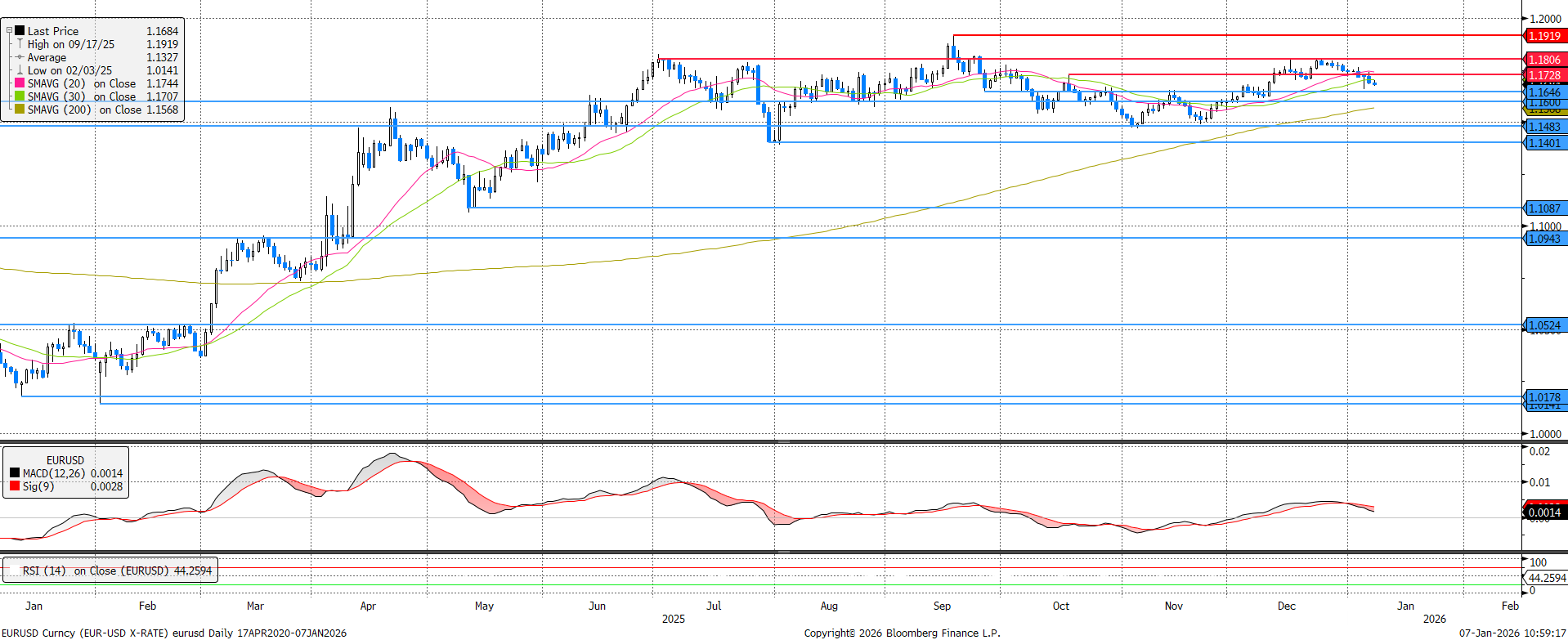 Apró mozgásokkal, de konzisztensen a paritás felé mozdult el a dollár az euróval szemben az utóbbi hetekben, amit az újév óta az MACD eladási jelzése is segíthetett. A 20 és 30 napos mozgóátlag mellett az 1,173-as szint alá is bekerült, célba véve az 1,165-ös támaszt. Az RSI 44-es szintje azt jelzi, hogy egyelőre folytatódhat a csökkenés.