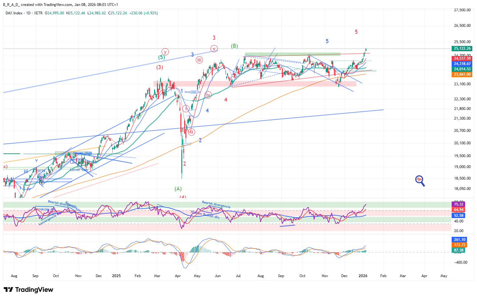 A következő időszakban további emelkedésre számítunk, az elsődleges célár 25.335, a másodlagos 25.420.