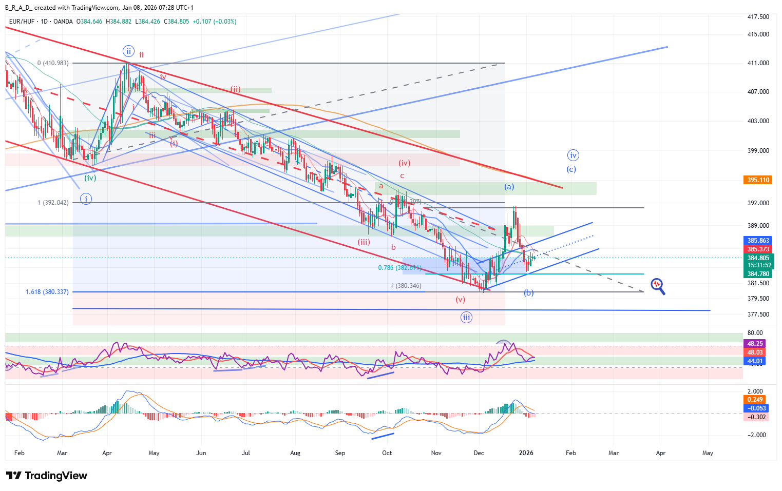 A következő napokban további emelkedésre számítunk, azonban előtte egy déli irányba lefutó korrekció lehetősége is nyitva van, az emelkedés célárai változatlanok: az elsődleges célár 386,05, a másodlagos 387,20.