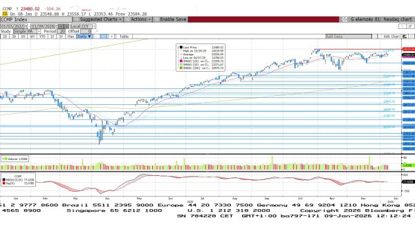 Óvatos mozgás jellemezte a Nasdaq-ot az elmúlt napokban. A december közepi átmeneti esést sikerült ledolgozni, azóta viszont új impulzusokra várnak a befektetők. Támaszt a 20 és a 30 napos mozgóátlag jelenthet, míg ellenállást a 23.765 pontnál hagyott rés felső éle, utána pedig már a 24.020 pontos történelmi csúcs lehet a következő állomás.