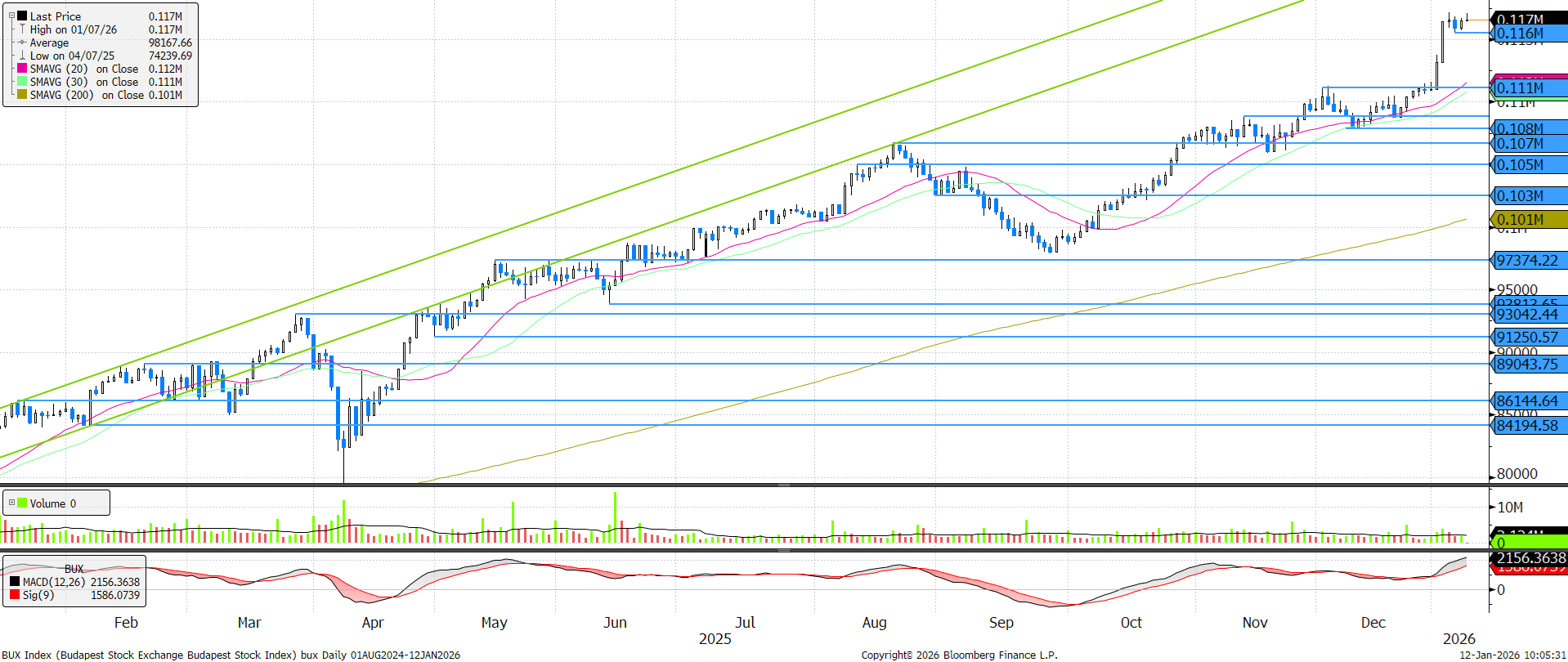 A rendkívül erős évkezdést követően megtorpanhat a BUX emelkedése. Utoljára tavaly májusban járt ilyen magasan az MACD indikátor, és az RSI indikátor 78 pontos értéke is túlvettségre utal, ezek mind intő jelek. Egyértelmű fordulós jelzés azonban még nem érkezett, és az indexet alkotó részvény komponensek egy részénél még további emelkedés következhet, így egyelőre nem várható jelentősebb fordulat a BUX indexnél, bár az elmúlt hét gyors emelkedése bizonyára le fog lassulni.