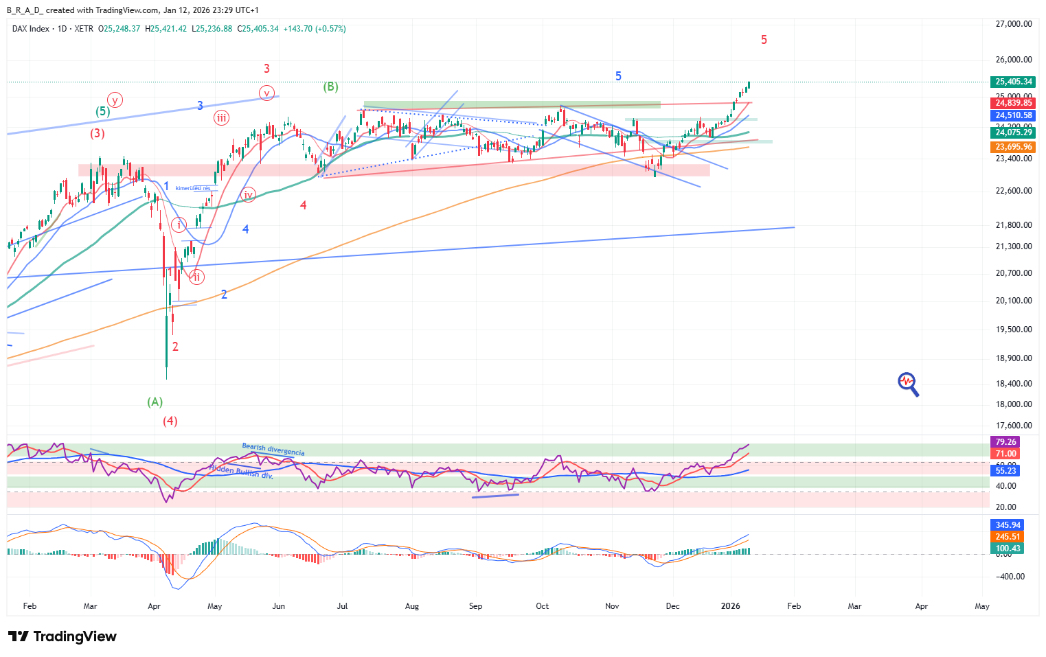 Az emelkedés felvitte a fenntartható bull zónába az árfolyamot, amennyiben a következő napokban sikerül a zónában maradnia, akkor az év első hónapjában nagy eséllyel további történelmi csúcsokat láthatunk a német indexben. A chart aktuális képében – ugyan megfelelő megerősítés még nem érkezett rá – de benne van, hogy egy gyorsulás esetén komoly száguldás következik be. Az általános esetben extrém és alacsony valószínűségűnek tekintett szituáció esélye aktuális helyzetben az átlagosnál magasabb, de ahhoz, hogy ezt elsődleges szcenárióként értelmezzük, a következő időszakban határozott jelet kell a piacnak erre mutatni, mert jelenleg egy 4-5000 pontos emelkedés a sávból kitörve csak extrém szélsőséges szituációként értelmezhető.