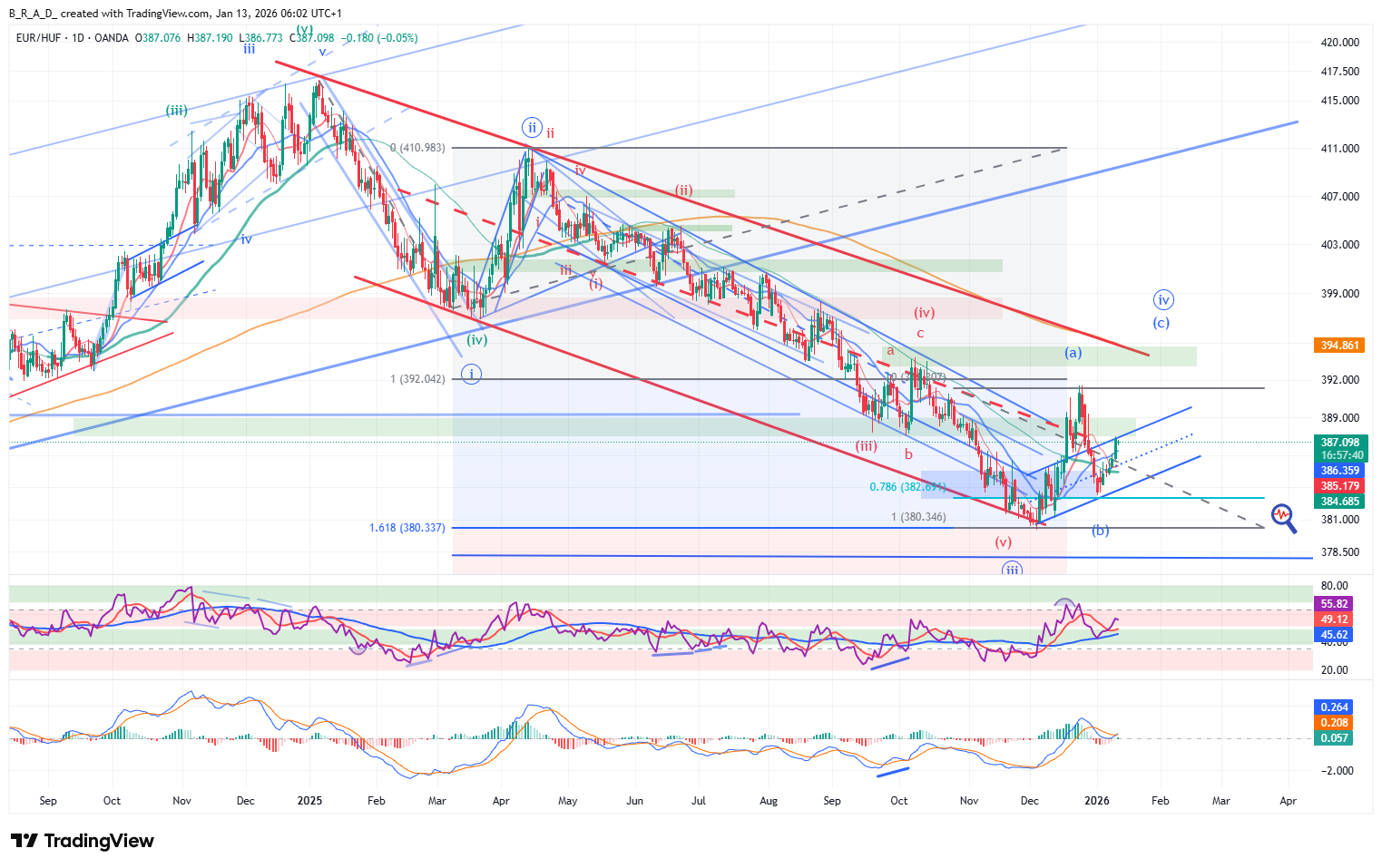 A gyengülést követően egy erőteljes forinterősödés érkezett a piacra, mely a lokális mélyponttól történő emelkedés Fibonacci 78,6 szintjéig erősítette vissza az árfolyamot, a szint megfeleltethető a mély korrekciós Zigzag hullám - aktuális pozícióban betöltött, nagyobb idősík alhullámának- ideális szintjével. A szint egyben a korábbi korrekciós csatorna aljával esik egybe, illetve a Relativ Strength