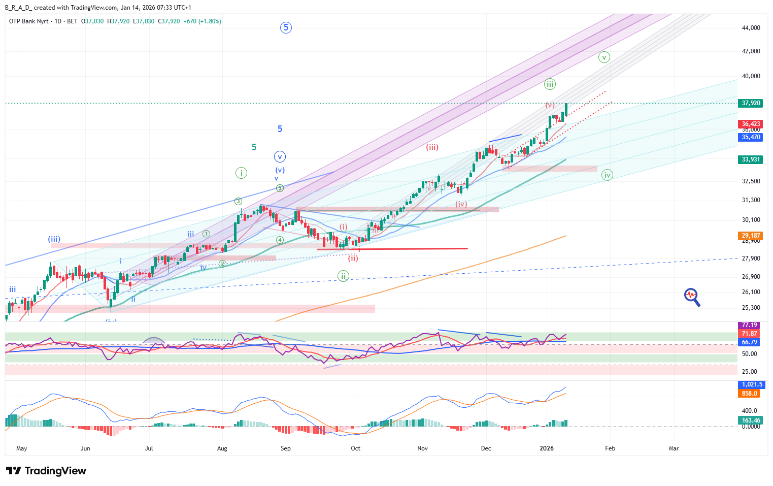 Napos idősíkon a fentiekkel ellentétben még nincs vételi klimaxban az árfolyam, így a tegnapi kereskedés lendületét folytatva, még akár nagyon messzire is eljuthat az árfolyam. Nagyobb idősíkon a szekvencia egyik lehetséges célára 37.000 környékére mutat (majd a következő 42.000 fölé), azonban ezen az idősíkon 500-1.000 pont eltérés még lehet hibahatáron belüli, sőt ennél nagyobb mértékű kilengés, egy spike erejéig előfordulhat, azaz hó közben felszúrhat példának okáért 2.000 pontot a célár fölé az árfolyam, majd a hónap végét már alacsonyabban a célár környékén zárva teljesíti az elvárást.