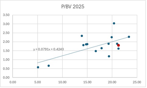 2025-ös ROE és P/BV értékek a régióban, s azok korrelációs egyenese*