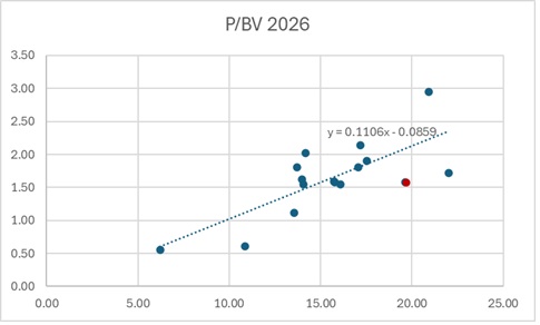 Ha pedig a többi európai részvényhez hasonlítjuk, a tőkemegtérülés (ROE) és az ehhez tartozó könyv szerinti értékhez való hasonlítás (P/BV) alapján, akkor a 2025-ös adatok alapján 17 százalék, a 2026-os értékek alapján pedig több mint 30 százalékos felértékelődési potenciált láthatunk. Nyilván az előbbi nagyjából mostanra, míg az utóbbi egy éves távlatra vonatkozik. Az ezen értékeket meglapozó számításokat reprezentáló grafikonok alább láthatók.