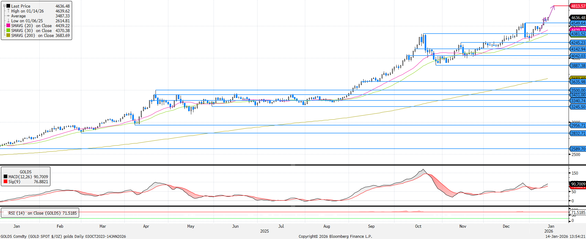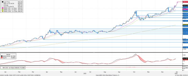 A venezuelai után az iráni helyzet is segíti az arany menedékeszköz szerepének felértékelődését. Ezen keresztül pedig az árfolyam is megiramodott. Az RSI szerinti túlvettség kiválthat korrekciót, viszont az általános geopolitikai bizonytalanság és a jegybanki felhalmozás továbbra is az emelkedés irányába mutat.