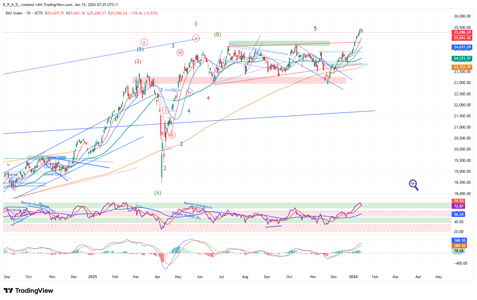 Az emelkedés felvitte a fenntartható bull zónába az árfolyamot, amennyiben a következő napokban sikerül a zónában maradnia, akkor az év első hónapjában nagy eséllyel további történelmi csúcsokat láthatunk a német indexben. A chart aktuális képében – ugyan megfelelő megerősítés még nem érkezett rá – de benne van, hogy egy gyorsulás esetén komoly száguldás következik be. Az általános esetben extrém és alacsony valószínűségűnek tekintett szituáció esélye aktuális helyzetben az átlagosnál magasabb, de ahhoz, hogy ezt elsődleges szcenárióként értelmezzük, a következő időszakban határozott jelet kell a piacnak erre mutatni, mert jelenleg egy 4-5000 pontos emelkedés a sávból kitörve csak extrém szélsőséges szituációként értelmezhető.