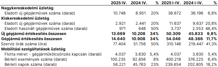 Véleményünk: Erős értékesítési számokat ért el az AutoWallis a negyedik negyedévben és az év egészében is. A nagykereskedelmi üzletág és a mobilitási szegmens az általunk vártnál jobb eredményt ért el, míg a szerviz órák száma és a használt gépjárművek értékesítése némileg elmaradt az előrejelzésünktől. A kiskereskedelmi szegmens új értékesítése pedig megfeletek 2025-ös várakozásunknak.