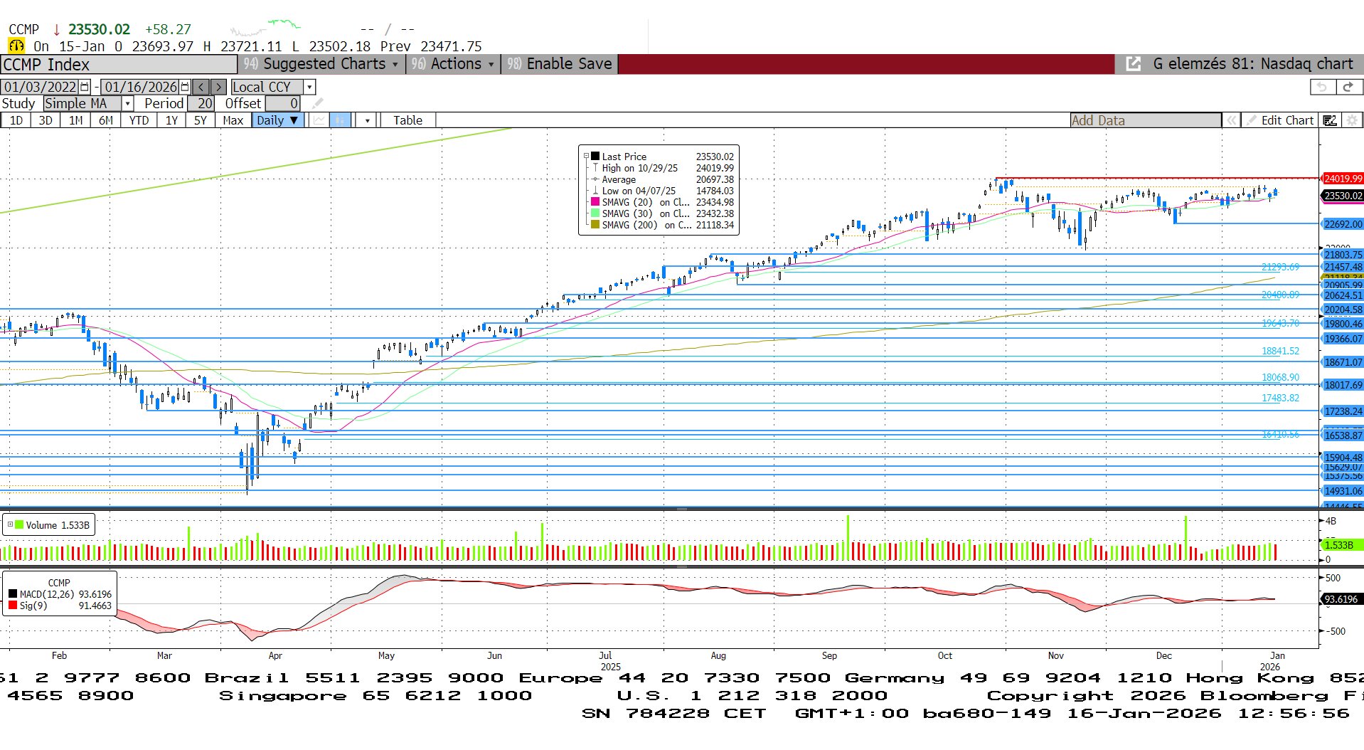 A 20 és 30 napos mozgóátlagok környékéről próbálkozott feljebb törni a Nasdaq a történelmi csúcsnál húzódó ellenállás irányába, de nem sikerült megérkezni a szinthez. Az inflációs félelmek ismét erősödni kezdenek, miközben a munkaerőpiac stabilizálódása szintén csökkenti a Fed-kamatvágások esélyét. Egyelőre az AI-szektor részvényei „tartják a lelket” az indexben.