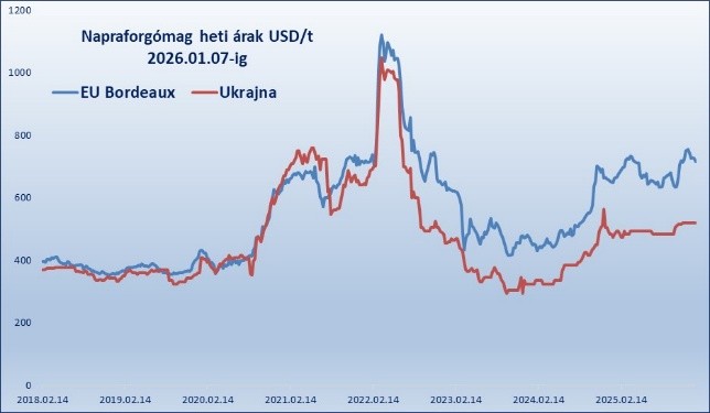 A 2024/25-ös szezonban 4,7 millió tonna magot termeltek, 2,4 tonnás hektáronkénti hozamok mellett. A következőben a területük további 18 százalékkal nőtt és a hozamok is javulnak. Exportjuk dinamikája igen magas, cél elsősorban India és az EU. Itt 2-3 millió hektárokról van szó. Olajuk és féltermékeik komoly piaci potenciállal bírnak. Nos, egyrészt ennek a nyomására építem, hogy nincs jelentős kitörési lehetőség a napraforgó árakban. Másrészt, a romló likviditás fényében, a készletek raktárból való kimozdítása sem halogatható sokáig. Elképzelhető, hogy néhány hétig még felfelé mozdulunk - ami jó kiszállási pontokat jelent! – de tartósan nem számítok erre. 2025-öt úgy tudtuk a januári kezdő árszinten zárni, hogy az utolsó héten ugratta meg pár kötés az árat. Kérem, ne érzelmi alapon hozzuk meg a döntéseinket, amelyeket aztán utólag akarunk majd racionalizálni, hanem piaci információk alapján!