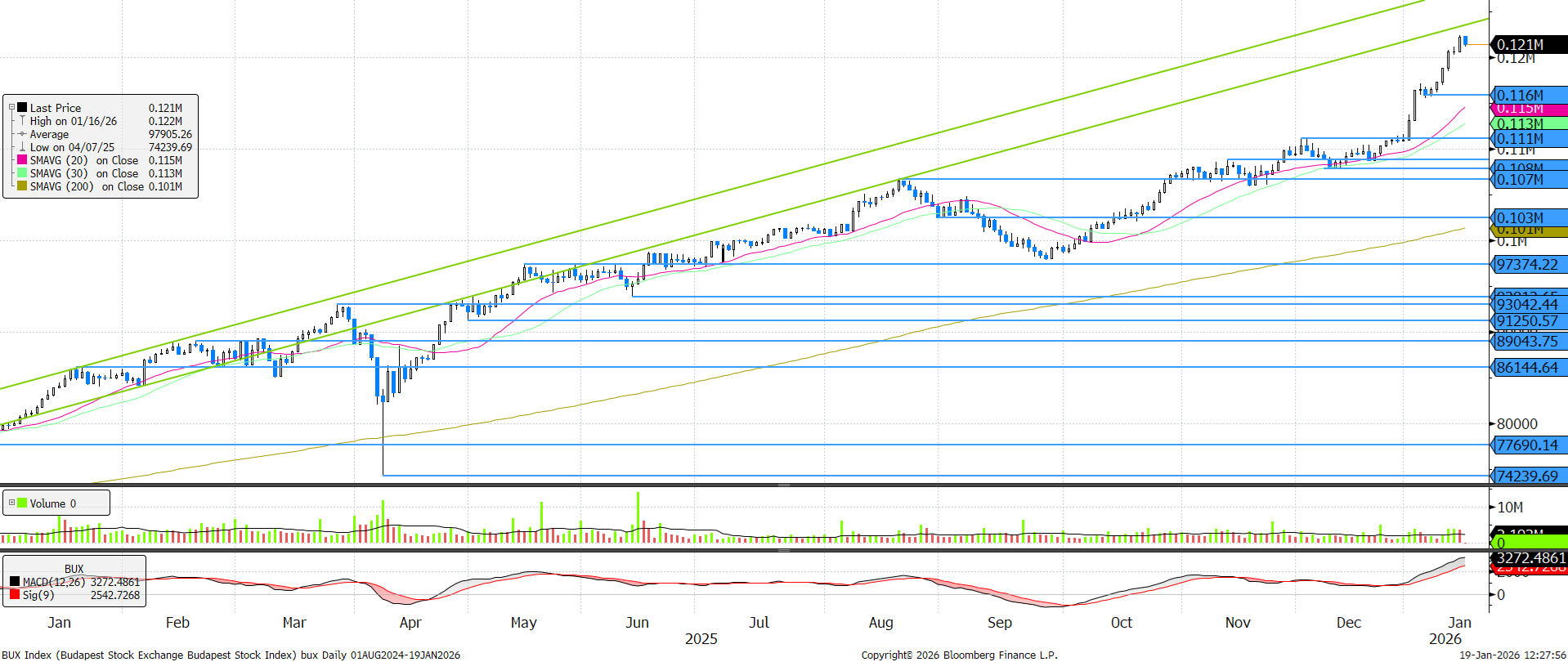 Az index két legnagyobb komponense, az OTP és a MOL esetében is túlvettség tapasztalható, így szinte egyértelműen adja magát, hogy a BUX index is erőteljes túlvettséget mutasson. Az MACD indikátor 15 éves csúcson van, az RSI 82 pontos értéke is túlvettségre utal. Ennek ellenére egyértelmű fordulós jelzés nem látható, ennek hiányában pedig csak oldalazást valószínűsítünk az indextől a következő napokra.