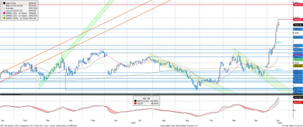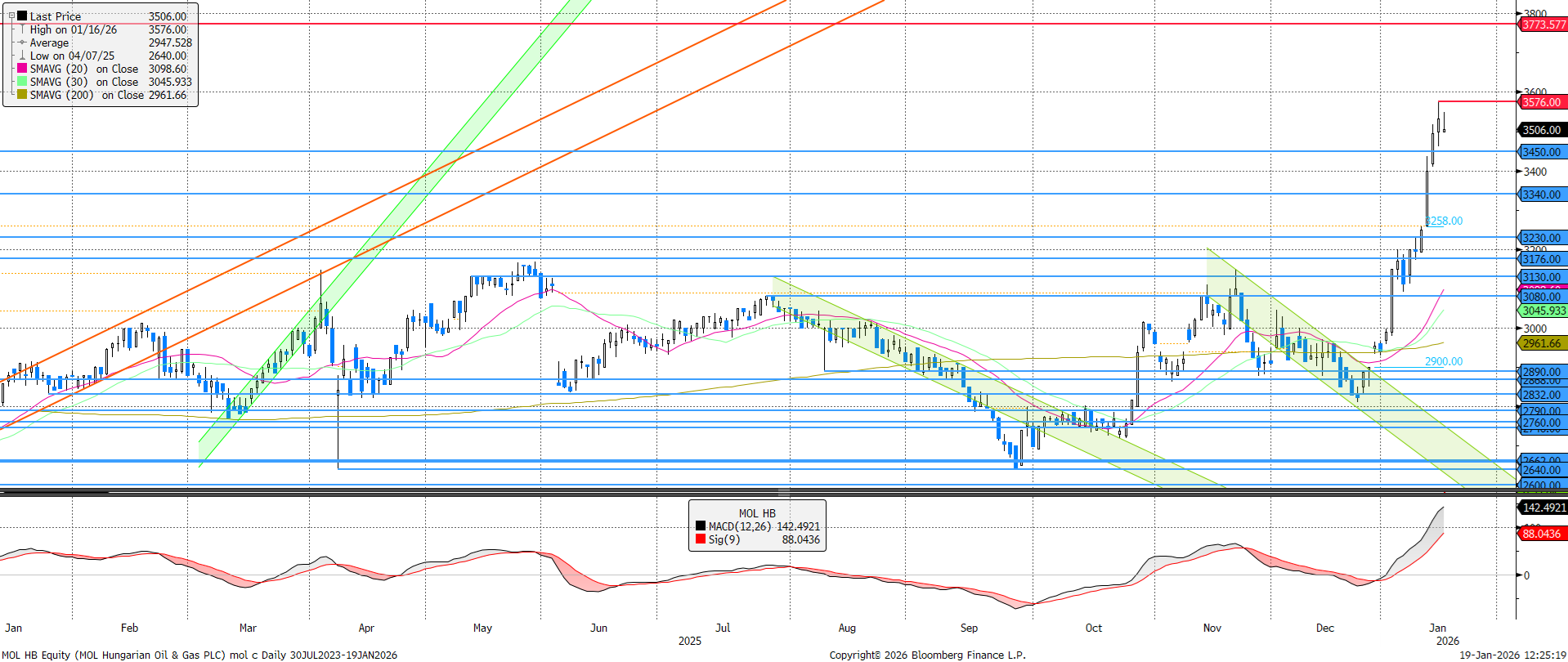 Az év eleje óta 20%-ot emelkedett a MOL árfolyama a NIS felvásárlásáról szóló spekulációkra. Ennek eredményeként extrém túlvettség alakult ki a részvénynél, az RSI értéke 79, és az MACD indikátor is 15 éves csúcson van. A fundamentális sztori miatt az erőteljes technikai túlvettség ellenére sem számítunk nagy korrekcióra, de az oldalazás reálisnak tűnik.