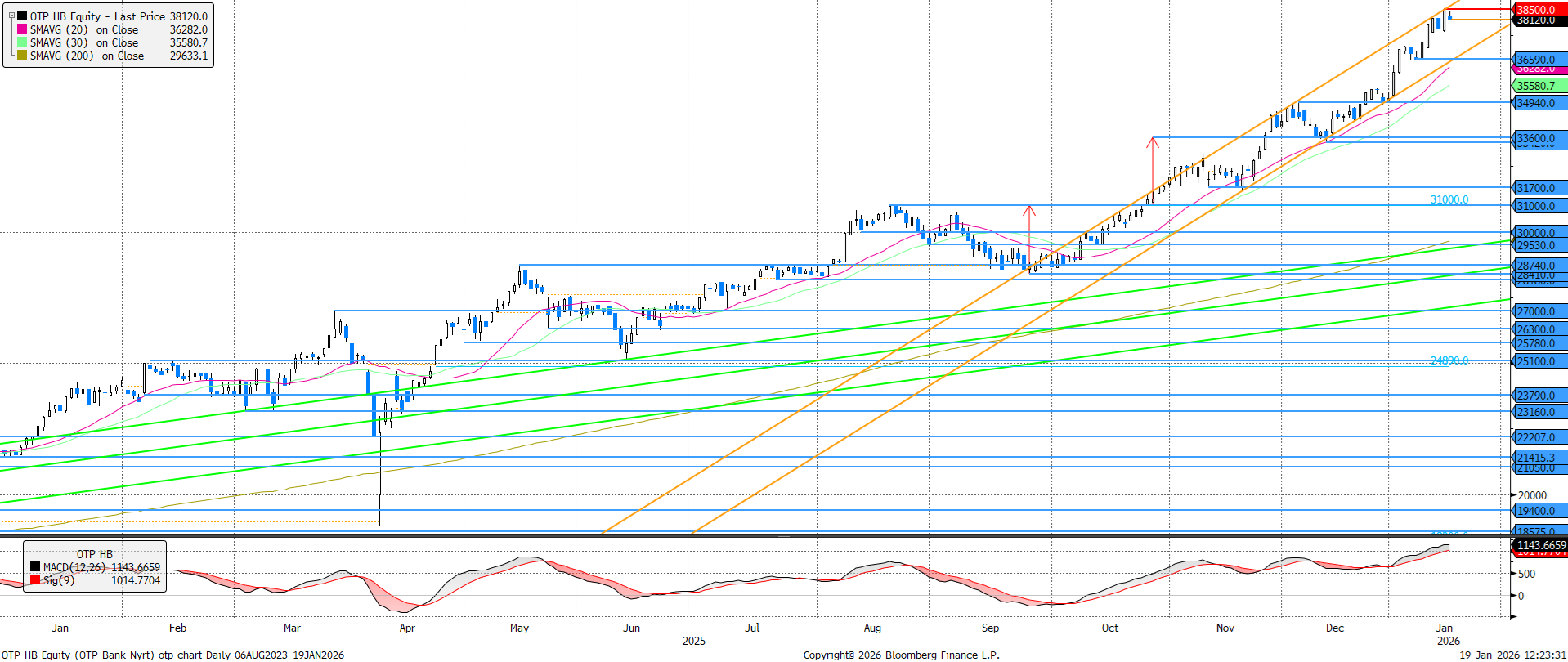 A technikai túlvettség ellenére újabb csúcsra emelkedett az OTP. A mostani globális hangulatromlás, az európai bankszektor emelkedésének megtorpanása, a technikai túlvettség és az emelkedő sáv felső élének érintése is mind abba az irányba mutat, hogy az árfolyam nem fogja tudni tovább folytatni a szárnyalást. Az RSI 72 pontos értéke enyhe túlvettséget mutat, az MACD indikátor pedig az elmúlt 15 évben nem volt ennyire magas. Legvalószínűbb forgatókönyvnek az tűnik, hogy oldalazni fog az árfolyam, és ezen keresztül valósulhat meg a technikai túlvettség korrekciója, ami egy csúcson lévő papírtól rendkívül erős viselkedést jelentene.