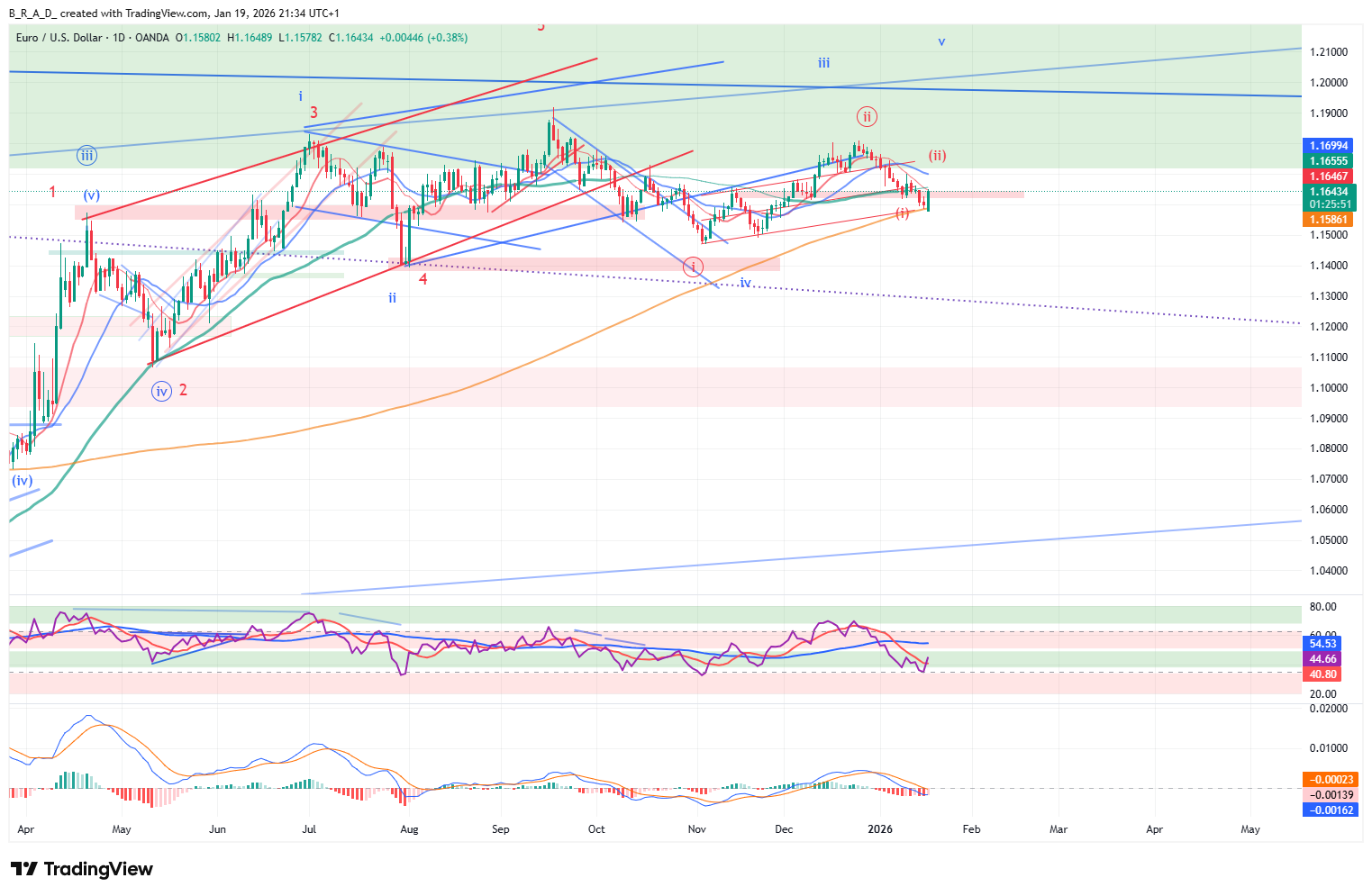 A Bullish Engulfing gyertyaformáció egyelőre nem hozta meg a kívánt eredményeket, visszaesett a támaszhoz az árfolyam. Egy ilyen erős jelzés, amennyiben nem hozza a várakozásokat mindenképpen figyelemfelhívó. Alternatív verzióban már régóta szerepel a charton az a lehetőség, hogy elkészült az északi irányba tartó szerkezet (egy hosszúlábú Ending Diagonal), a szeptemberi tetőről egy bázisépítés folyamata látszik, mely aktuálisan akár a végéhez is közeledhet, a második, kis kettes hullám futhat ebben az esetben. Erős támogatást a formáció a 200 napos mozgóátlag letörésével kapna, jelenlegi szint 1,158 környékén található. A további bull remények fennmaradásához a támasznak (1,161) ki kell tartania és gyors fordulat szükséges.