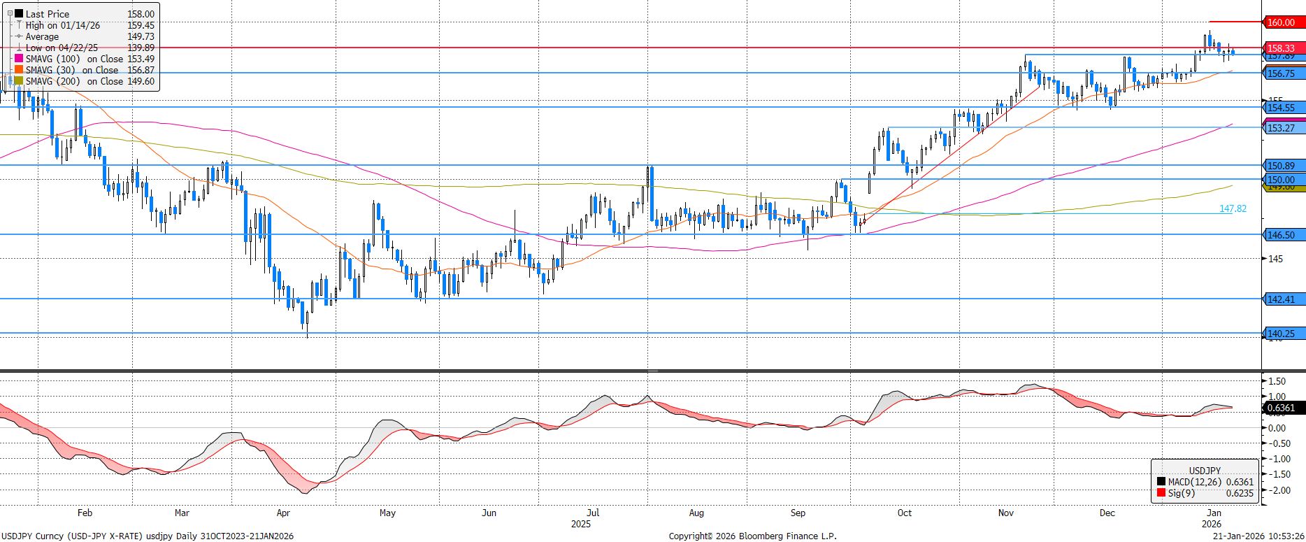 A jen gyenge szereplése kissé enyhült, amit a dollár gyengülése segített. A technikai kép alapján elképzelhető rövidtávú csökkenés az USDJPY árfolyamban, már ha át tudja törni a 157,9-es támaszt. Az MACD még csak közelíti az eladási jelzést, ami lendületet adhatna a korrekciónak. Viszont picivel hosszabb távon a Japánban február 8-ra meghirdetett előrehozott alsóházi választások belerondíthatnak ebbe. Ennek kimenetele a kormánynak kedvezhet, ez a szcenárió pedig fiskális expanziót és jen leértékelődést hozna.