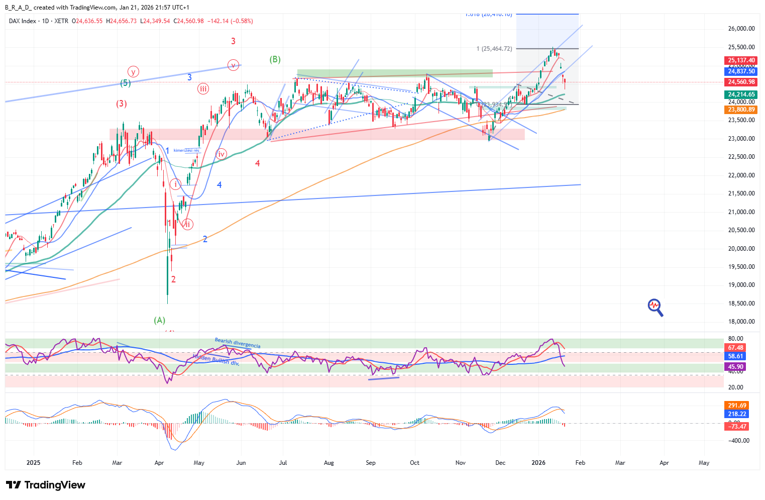 Réssel átvitte a csatorna alját és a következő támaszig esett az árfolyam, erős bearish jelezés. Nagy az esélye annak, hogy ilyen lendület után a 24.400 környékén lévő kisebb támaszt is átviszi az árfolyam, és egészen az 50 napos mozgóátlagig esik.