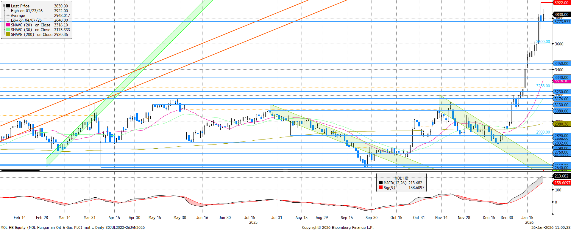Új történelmi csúcsra, 3.922 forintra emelkedett a MOL. Idén eddig már 30%-ot emelkedett az árfolyam. A katalizátor a NIS felvásárlása volt, melynek pozitív hatása mostanra már beárazódhatott, bár a szektortársakhoz képest továbbra is diszkonton forog a MOL. A meredek emelkedés, a technikai túlvettség, például az RSI 85 pontos értéke fordulatot hozhat az árfolyamban. A pénteki mozgás is a piac elbizonytalanodásának jele lehet.