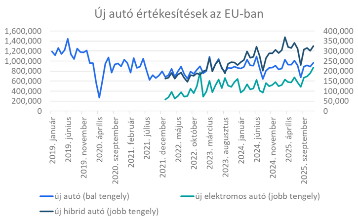 2025-ben 10,8 millió új személygépkocsit értékesítettek az EU-ban, ami visszafogott, 1,8%-os éves bővülést jelent. A növekedés motorja az elektromos autók értékesítése volt, ez csaknem 30%-kal 1,88 millió darabra bővült az egyre nagyobb választéknak és nagyobb versenynek köszönhetően. Az év vesztese a Tesla, melynek eladásai 37,9%-kal csökkentek, míg a nagy feltörekvő BYD eladásai 228%-kal szárnyaltak. Az éves darabszámot nézve a BYD még nem érte be a Teslát (129 ezer vs 150 ezer), de az ellentétes dinamika alapján ez idén már nagy valószínűséggel meg fog fordulni.