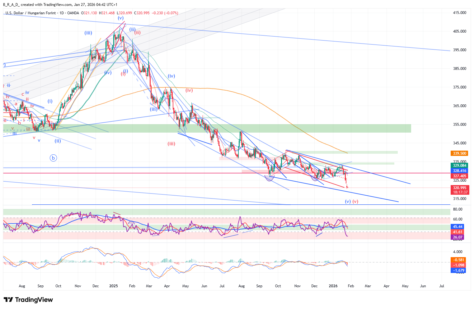 A következő időszakban a támaszon való elakadásra és egy 2-3 forintos sávban történő oldalazásra számítunk, a sáv 319,30-322,90.