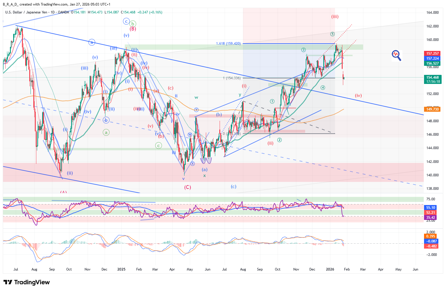 Az emelkedés elérte az ellenállási zóna tetejét, majd gyors fordulat következett be és letörte az emelkedő csatorna tetejét, majd tovább szakadt az árfolyam. Az első jelentősebb támaszszintet letörte 154,600 környékén és csak a második tudta megfogni 153,300 magasságában, legalábbis az aktuális chart arra utal, hogy sikerül az esést megállítani.