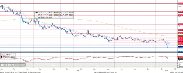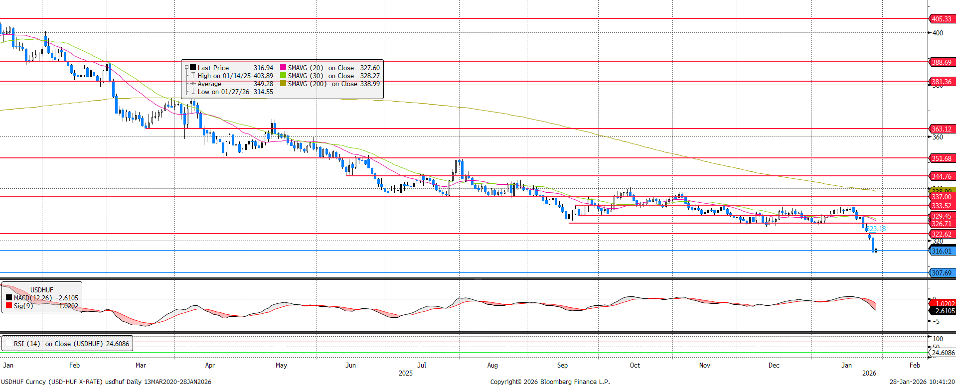 A dollárgyengülés elhozta a forint hatalmas raliját, 316 alá is benézett a jegyzés, ami 4%-os felértékelődést jelent az előző héthez képest. A gyors zuhanást követően viszont padlót foghatott az árfolyam, erre utal az RSI 25-ös szintje is, ami a menetelés végét jelezheti, visszatesztelés következhet rövidtávon.