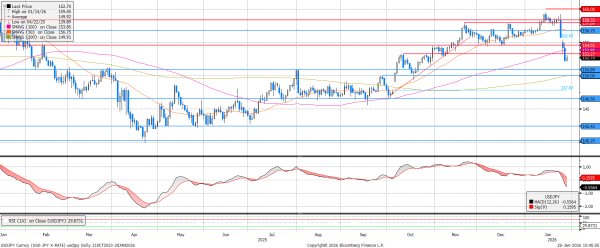 Az USDJPY 6 egységgel romlott az elmúlt egy hétben. Egyrészt felmerül a lehetősége annak, hogy 15 év után az Egyesült Államok segíthetne a jen intervenciójában, ami azonnali jen erősödést váltott ki. Másrészt Donald Trumpot — a kommunikációját tekintve legalábbis — nem foglalkoztatja a dollár masszív gyengülése. Az MACD eladási jelzését követő negatívba fordulása tompíthatja a visszateszt erejét, első körben a 153,3-as ellenállást ostromolhatják a vevők.