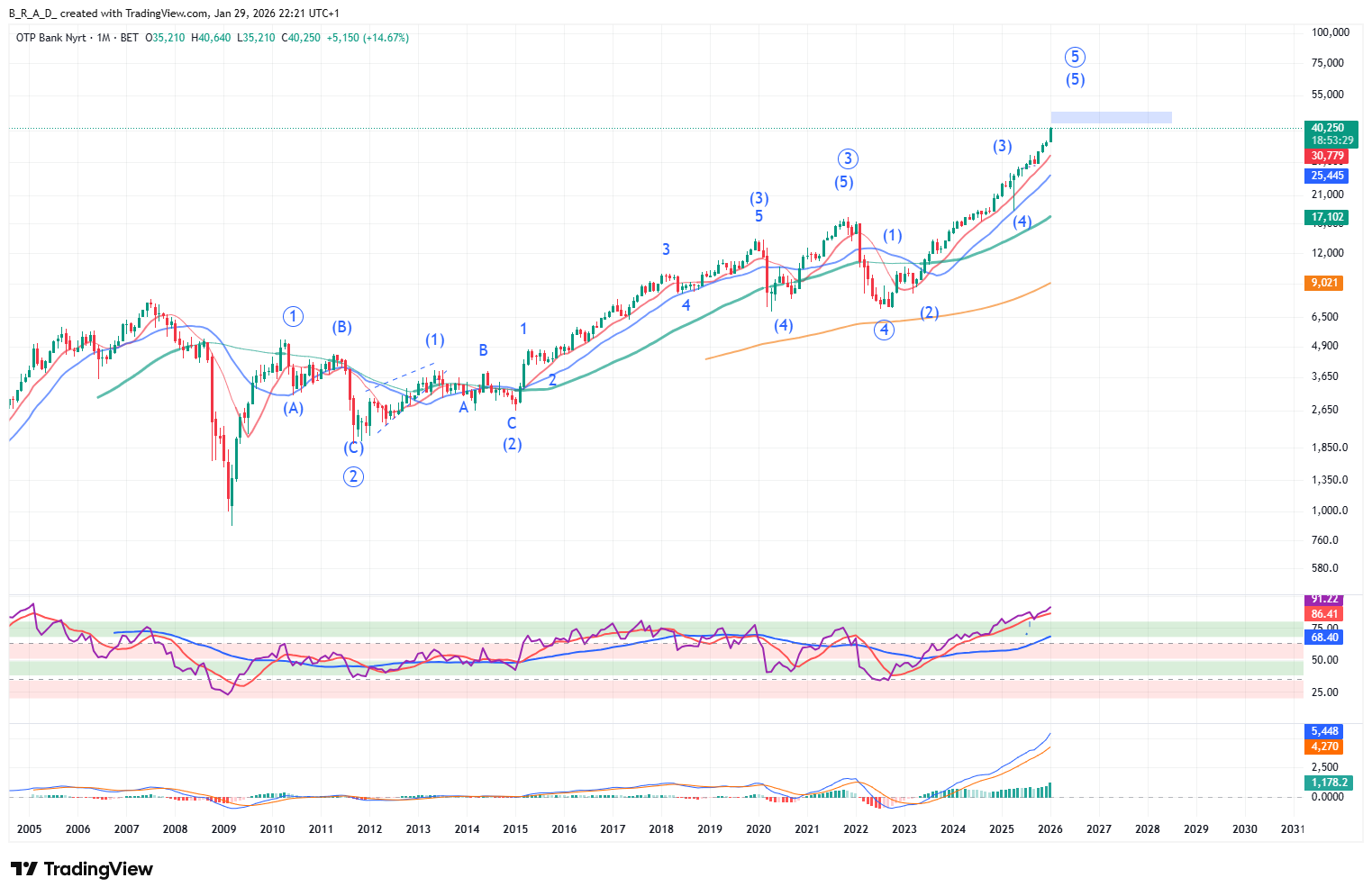Az RSI már régóta extrém túlvett értéket mutat, a 10 havi mozgóátlag felett tartózkodik az árfolyam, azonban az ilyen esetekre sokszor jellemző, trendvégi hatalmas gyertya megjelent a charton (januárban eddig megközelítőleg +15,5%), ez pedig azt jelenti, hogy egyre nő az esély arra, hogy hamarosan bekövetkezzen a tetőzés.