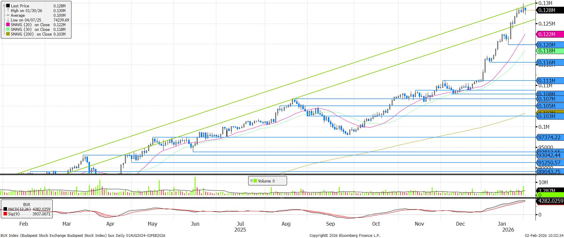Pénteken új történelmi csúcsra emelkedett a BUX, jelenleg azonban nem látszik, hogy mely komponens lenne képes további lendületet adni az indexnek. MACD és RSI alapon is erősen túlvettnek számít az index, igaz, utóbbi indikátor szerint már január óta és mégis szárnyalt az elmúlt hetekben. A hétre oldalazást, kisebb csökkenést valószínűsítűnk.