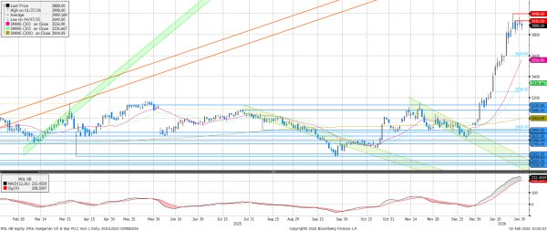 A MOL új történelmi csúcsot ért el közel 4.000 forintnál, megdöntve a korábbi, 2007-es csúcsot, ami 3.877 forint volt. A történelmi magasságból lefordult az árfolyam, miközben technikai alapon túlvett, így a következő napokban csökkenés valószínűsíthető. Támaszt a 3.600-nál hagyott rés jelenthet.