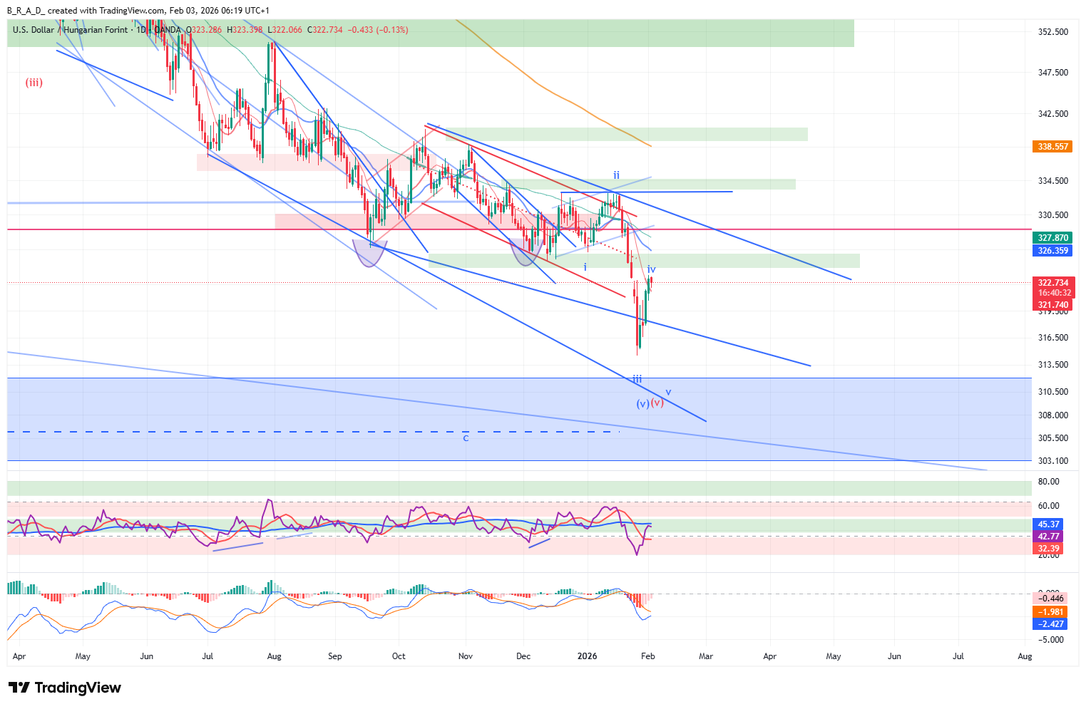 A következő időszakban minimális emelkedést követően esésre számítunk, melynek elsődleges célára 320,70, a másodlagos 315,05, a harmadlagos 310,50 alá.