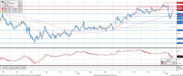 Rövid életű volt a jen erősödése a dollárral szemben, ismét a tavaly év végi szintek váltak relevánssá. Gond nélkül gyűrte maga alá a 154 körüli 100 napos mozgóátlagot az USDJPY, sőt, a január végén kialakult rést is könnyen betöltötte. Mostanra a 30 napos mozgóátlaggal kiegészült 156,8-as ellenállás jelenti a legnagyobb akadályt. Bár az MACD csak közelít a vételi jelzés leadásához, kimenetelétől függően még katalizálhatja a hétvégi japán alsóházi választások eredménye. Egyelőre az oldalazás tűnik a legvalószínűbbnek.