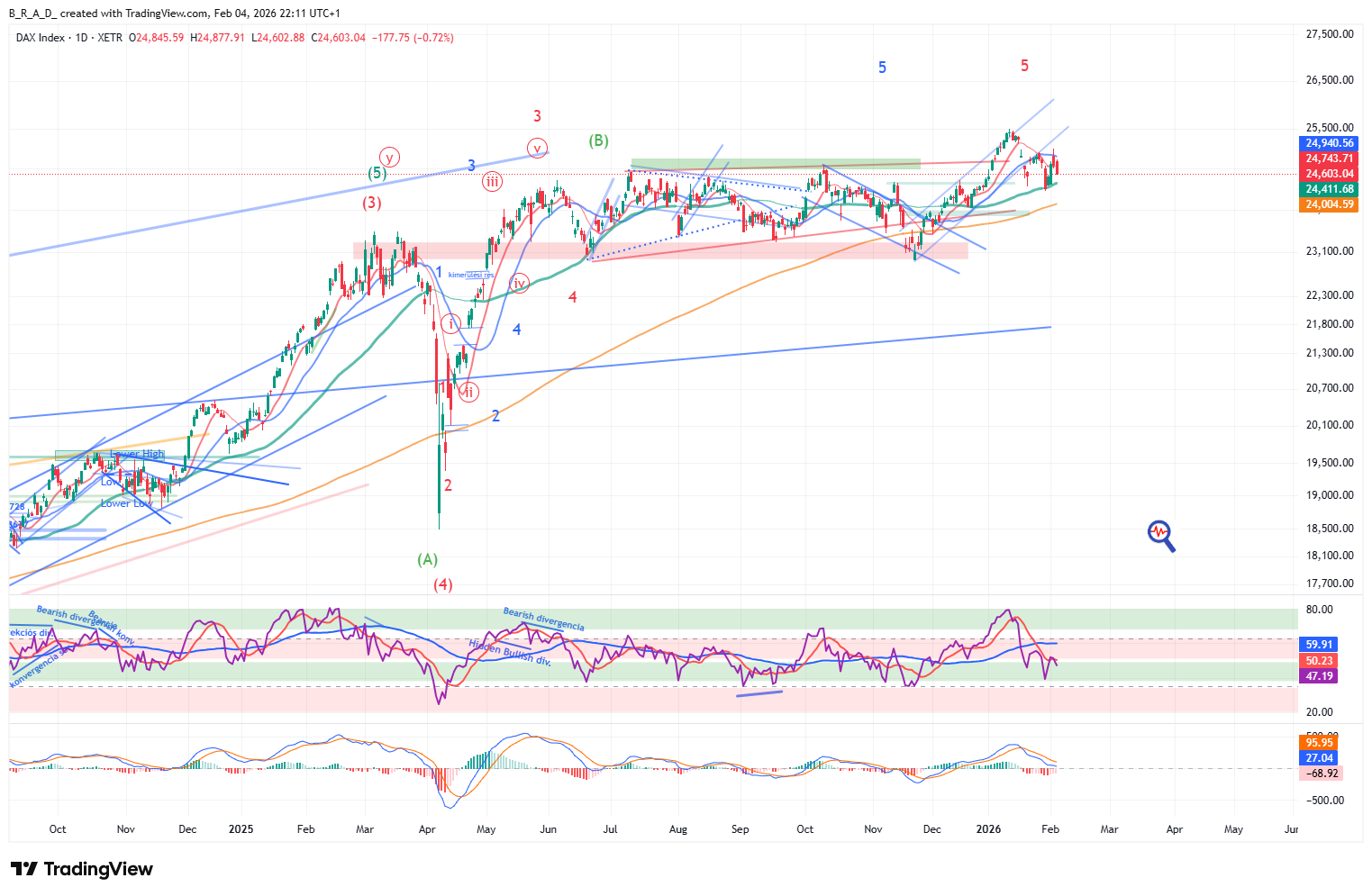 A következő időszakban további esésre számítunk, az elsődleges célár ismét 24.411, a másodlagos 24.004.