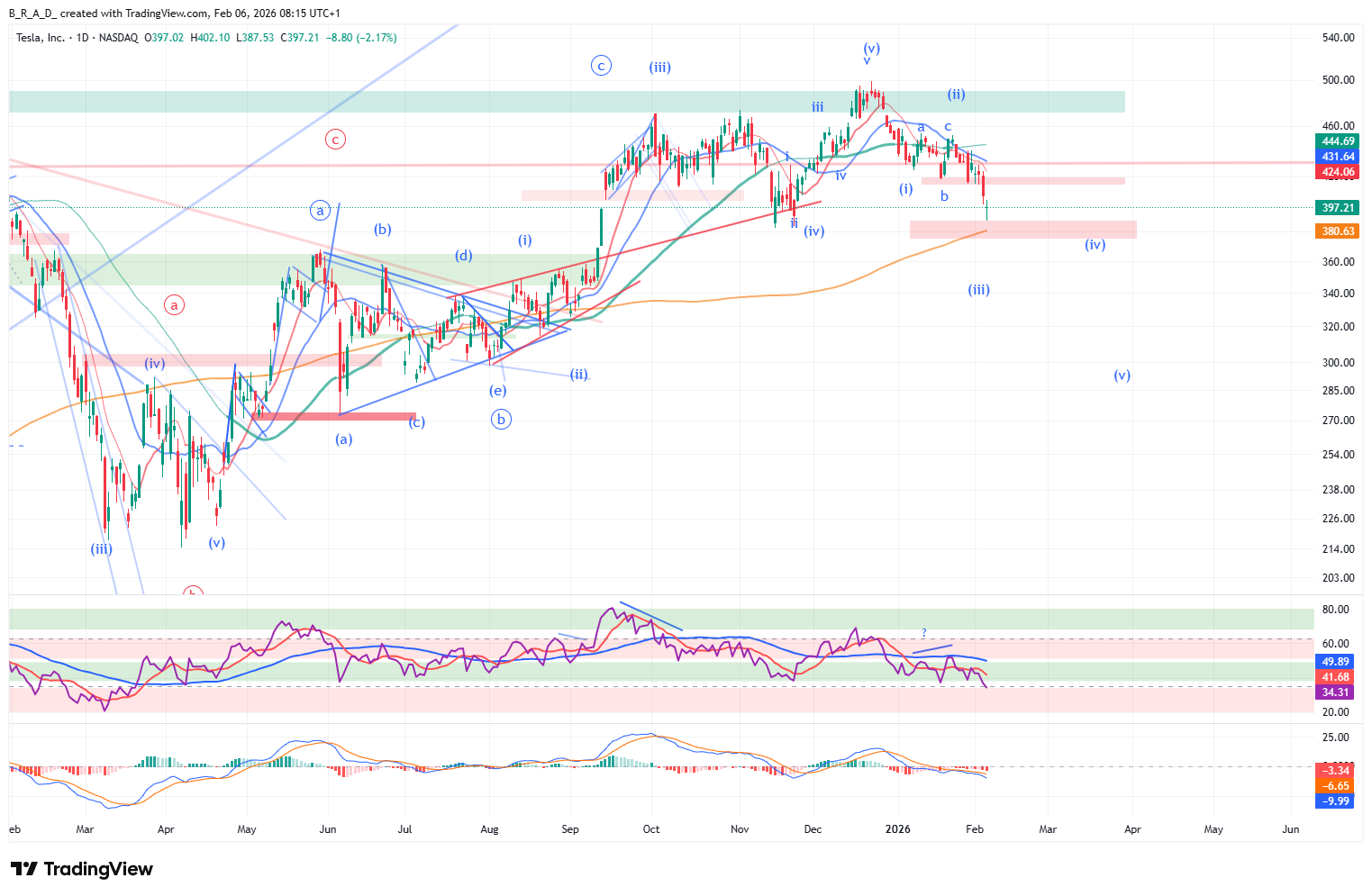 Megérkezett a várt 380-400 közötti szintre az árfolyam. Ellenállások előtt áll a piac, fordulós jelzés nem alakul ki, az ellenállási zónában történő további esés a 200 napos mozgóátlagig való ereszkedés reális lehetőség.