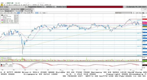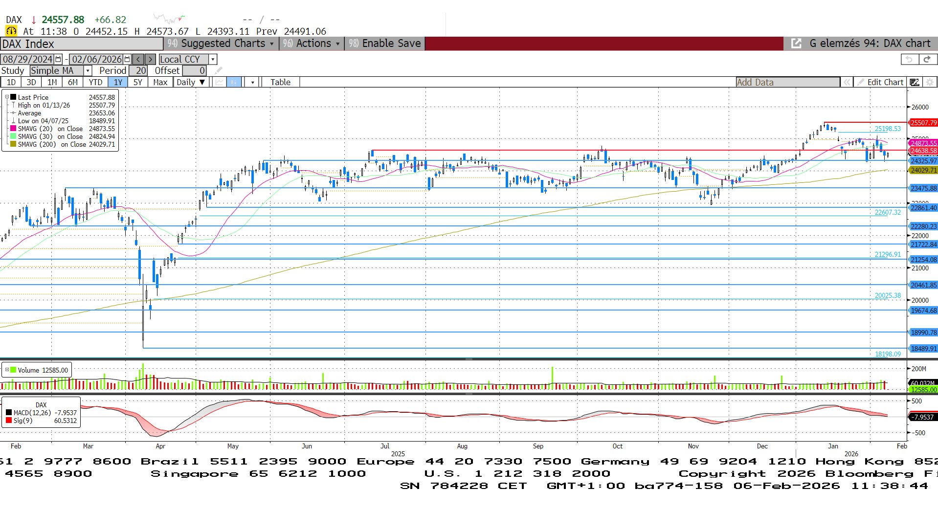 Emelkedéssel kezdte a hetet a DAX, de a negatív részvénypiaci hangulat közepette elakadt a felpattanás a 20 napos mozgóátlagban, onnan pedig esés következett. A 24.326 pontos szint, mely 2025 második felében többször ellenállásként, idén pedig támaszként funkcionált, ismét kitartott. A hét utolsó kereskedési napján felfelé tör a német tőzsdeindex.