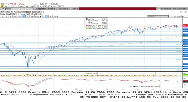 A nagy amerikai felhőszolgáltatók negyedéves jelentéseit negatívan fogadta a piac, és a kedvezőtlen hangulat nyomást gyakorolt az S&P 500-ra is. A január eleji csúcsnál húzódó szint közvetlen közeléből jött a lefordulás, és egészen a 6.797 pontos szintig ütötték az indexet. Az eladói nyomás enyhülhet, mivel az RSI indikátor már túladottság közelében van. Ellenállást a 20 és a 30 napos mozgóátlag illetve a korábbi csúcs jelenthet.