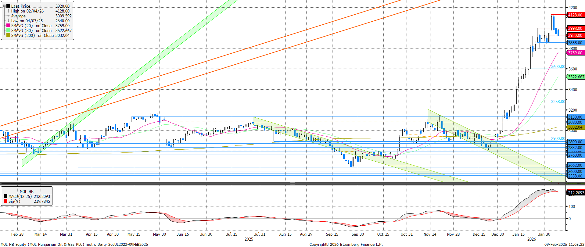 Átvitte a 4.000 forintos lélektani szintet a MOL, onnan azonban lefordult az árfolyam és mostanra az MACD indikátor is eladási jelzést adott. Az árfolyam messze elszakadt a mozgóátlagoktól, így akár erőteljesebb korrekció is következhet. Támaszok 3.858 és 3.759 forintnál láthatóak.
