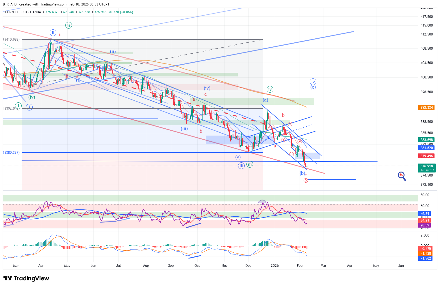 Mélyebbre esett az árfolyam, mint ahogyan az előzetes várakozások szóltak. Marad a kék korrekciós csatornában az árfolyam, a mozgás még nem okozza az elsődleges szcenáriónk törését, továbbra is lehetséges, hogy egy b alhullám közlekedik déli irányba, mely a korrekció második alhulláma és egy forintgyengülés mellett érkezik meg a harmadik alhullám, mely 390 fölé viszi majd az árfolyamot. Elérte az árfolyam a nagyobb (pirossal jelölt) korrekciós csatorna alját, mely erős támaszként viselkedhet az elkövetkező időszakban.