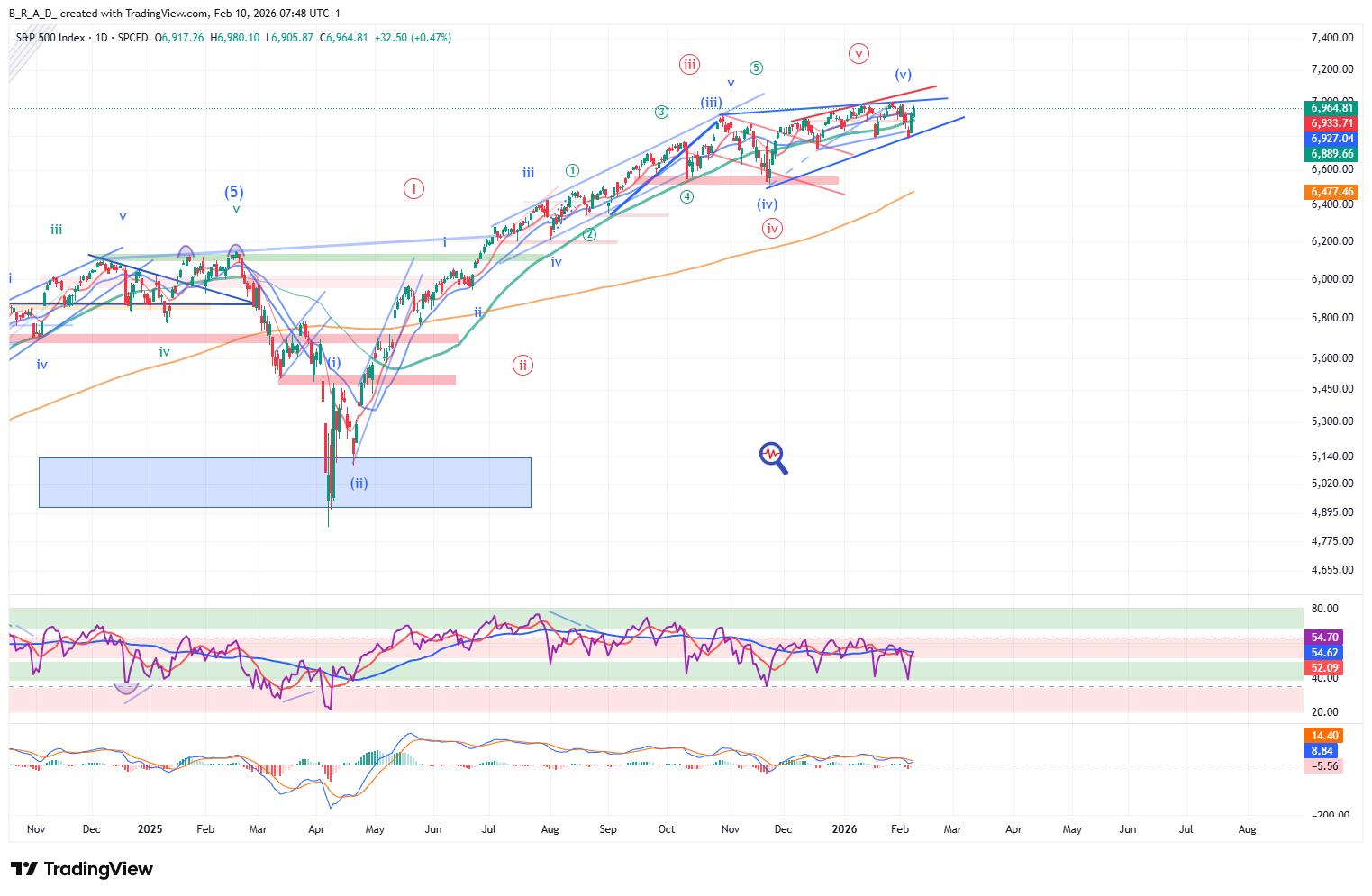 Megjelent és megerősítést kapott egy másik konfiguráció, melynek a célára 7.005, bekövetkezési valószínűsége 58%. Érdekessége a jelzett szintnek, hogy pont a korábbi tetőket összekötő egyenes vonalára esik a célár (kékkel). Ez a szint a korábbi történelmi csúcs felett helyezkedik el.