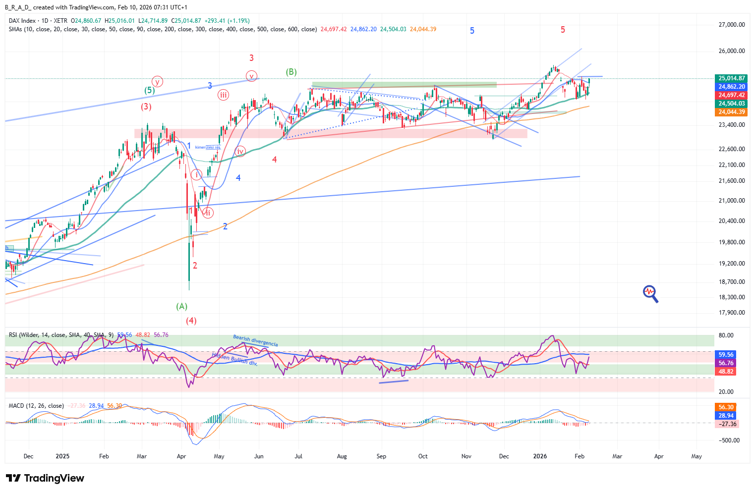 Technikai értelemben egy dupla aljat láthatunk. 25.100 átlépésével (nyakvonal) megkaphatja a megerősítést, a formáció célára 26.000 alá mutat. A formáció megerősítését jelenheti az MACD-n látható ZLR (Zero Line Reversal).