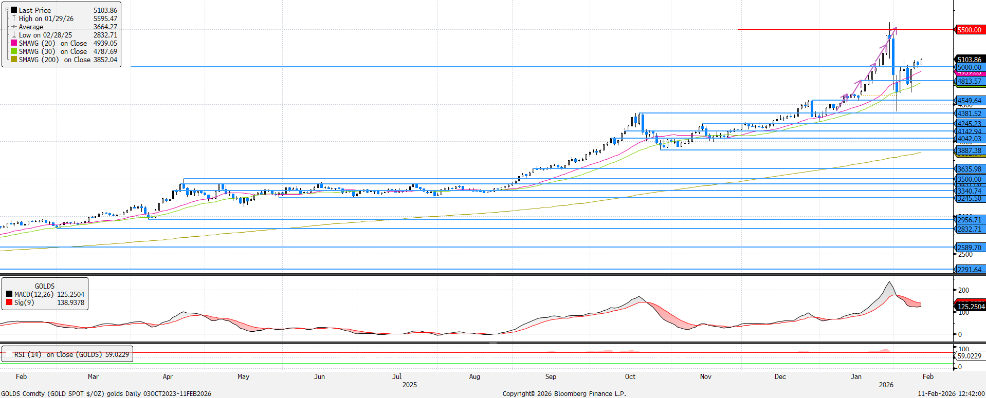 Az elmúlt hetek volatilitása csillapodni látszik az utóbbi napokban, 5000 dollár felett közel sem akkora a napi árfolyamváltozás egyik irányba sem. Az MACD szemezget a vételi jelzéssel, aminek gyújtózsinórja lehet, ha az amerikai munkaerőpiaci adatok a vártnál rosszabbul alakulnak. (A Feden keresztül az alacsonyabb kamatok ismét felhajthatják az arany árazását.) Ha a februári mozgásokat vesszük figyelembe, akkor egy újabb leszúrás elképzelhető, de összességében emelkedő trend van folyamatban.